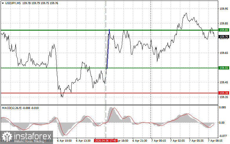 The price test at 159.55 occurred when the MACD indicator was just starting to move up from the zero mark, confirming the correct entry point for buying the dollar. As a result, the pair rose towards the target mark of 159.80.