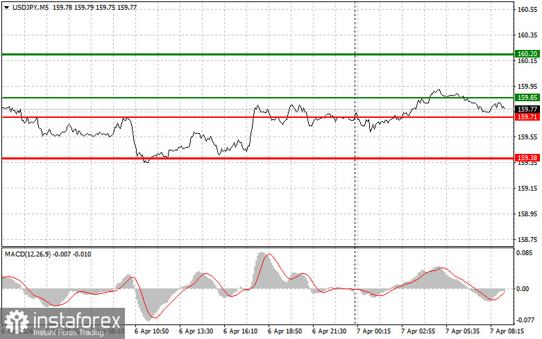 Scenario #2: I also plan to buy USD/JPY today in the event of two consecutive tests of the price 159.71 when the MACD indicator is in the oversold area. This will limit the pair's downward potential and lead to a market reversal upwards. A rise to the resistance levels of 159.85 and 160.20 can be expected.
