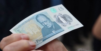 Uang yang terbuat dari plastik polimer tersebut bergambar wajah mantan Perdana Menteri Inggris Winston Churchill dengan slogan berisi "tidak ada yang diberikan kecuali darah, jerih payah, air mata, dan keringat".