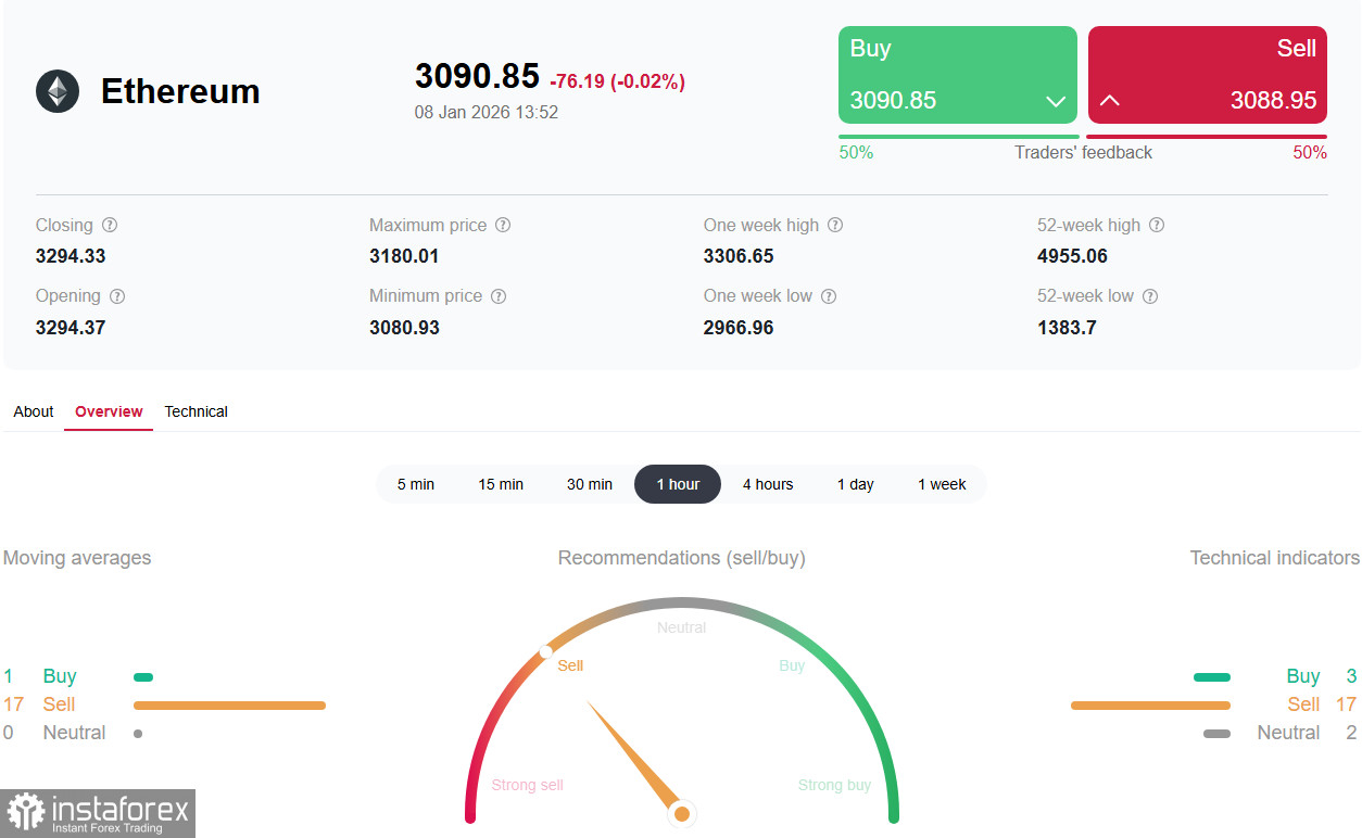 Ethereum показывает более слабую динамику по сравнению с биткоином. Цена ETH снижалась в четверг 8 января к 3085.00, потеряв более 6% от пика 7 января. Это происходит на фоне, казалось бы, позитивного фактора: за первые дни недели, начавшейся 5 января, ETF на Ethereum привлекли около 340 млн долларов, а основными драйверами притока стали фонды BlackRock (ETHA), Fidelity (FETH) и Grayscale (ETHE), судя по данным из открытых источников.