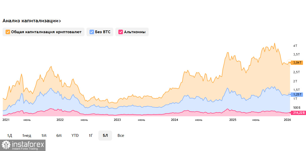 По состоянию на 8 января 2026 года общая капитализация криптовалютного рынка сократилась еще примерно на 1,63% за сутки и составляет около 3,04 трлн долларов, по данным TradingView, что отражает снижение аппетита к риску среди инвесторов.
