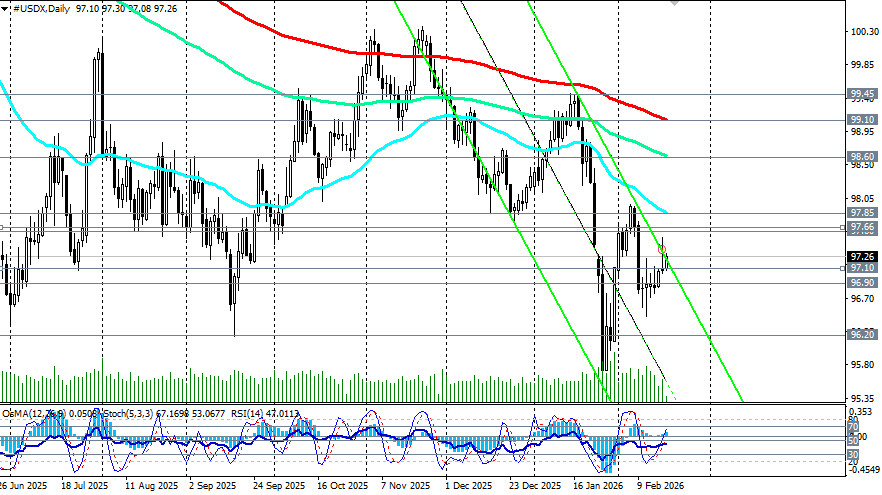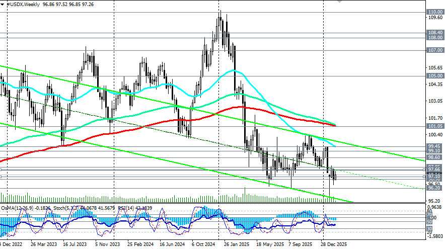 С технической же точки зрения индекс USDX балансирует в зоне стратегического уровня поддержки 96.90 (ЕМА200 на месячном графике). После падения 2025 года индекс остается ниже ключевых скользящих средних: 99.10 – ЕМА200 на дневном графике, 101.05 – ЕМА200 на недельном графике.