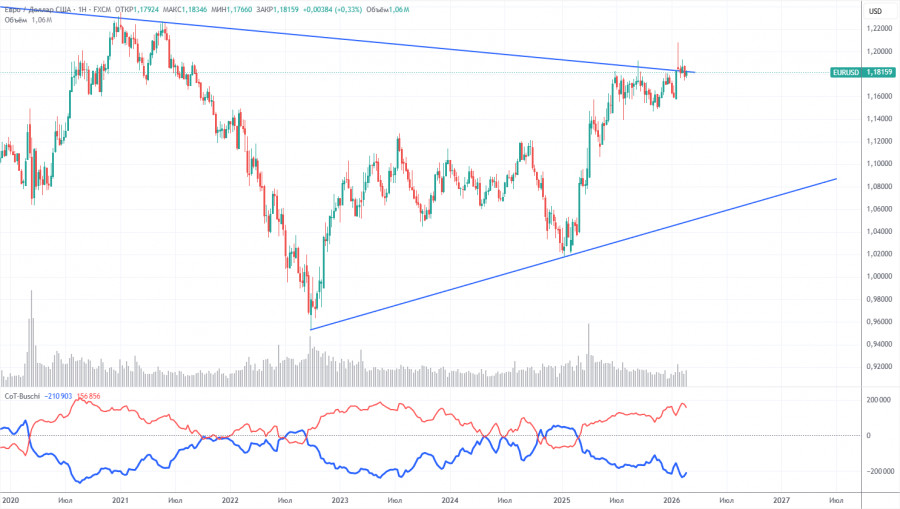 Последний отчет COT датирован 24 февраля. На иллюстрации недельного ТФ отлично видно, что нетто-позиция некоммерческих трейдеров остается «бычьей», а с тех пор, как Трамп вступил в должность президента США во второй раз, падает только доллар. Мы не можем сказать, что падение американской валюты продолжится с вероятностью 100%, но текущее развитие событий в мире намекает именно на этот вариант.