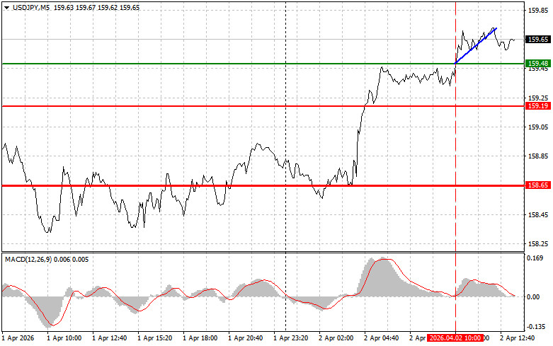Разбор сделок и советы по торговле японской иенойТест цены 159.48 пришелся на момент, когда индикатор MACD только начинал движение вверх от нулевой отметки, что стало подтверждением правильной точки входа на покупку доллара. В результате пара выросла почти на 30 пунктов. Во второй половине дня внимание рынка будет приковано к публикации данных по еженедельным заявкам на пособие по безработице и сальдо торгового баланса США. Позитивные результаты этих отчетов, как ожидается, спровоцируют рост спроса на американскую валюту и окажут еще большее
