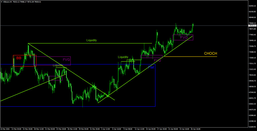 Ситуация на криптовалютном рынке остается без изменений. «Цифровое золото» продолжает восходящую коррекцию в рамках нисходящего тренда с 6 февраля. То есть 2,5 месяца. И это тот факт, от которого сейчас следует отталкиваться. Так как восходящая тенденция на 4-часовом ТФ не сломана, коррекция может продолжиться. На дневном ТФ биткоин наконец-то отработал ближайший «медвежий» FVG, который является областью POI для коротких позиций. Напомним, что отработка FVG – это не гарантия получения сигнала и движения в нужном направлении. Сначала должен сформироваться сигнал, случится слом структуры на ТФ на два ранга ниже текущего, сформироваться «медвежьи» паттерны на младшем ТФ. Таким образом, в ближайшее время мы бы посоветовали ожидать слома восходящей структуры на часовом ТФ, который по текущей технической картине произойдет ниже уровня 77 200$ и формирования других «медвежьих» паттернов и сигналов.