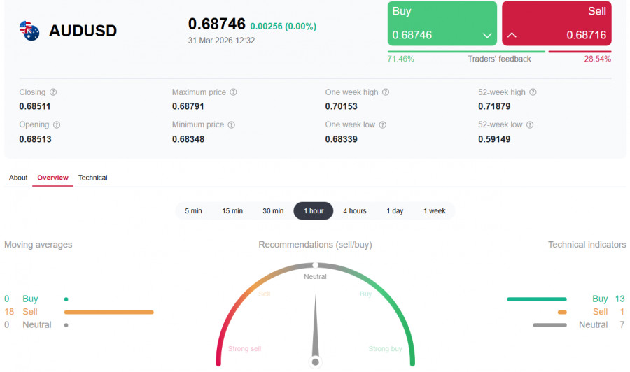 *см. также: Торговые индикаторы InstaForex по AUD/USD Пара AUD/USD завершает первый квартал 2026 года в состоянии неопределенности, консолидируясь в районе 0.6840-0.6870 в ходе первой половины сегодняшнего торгового дня после публикации протоколов мартовского заседания Резервного банка Австралии и заявлений президента США Дональда Трампа о готовности завершить войну с Ираном. Австралийский доллар оказался в эпицентре столкновения двух сил: с одной стороны - ястребиный RBA, сохраняющий возможность повышения ставки в мае, с другой - укрепляющийся доллар США и растущие стагфляционные