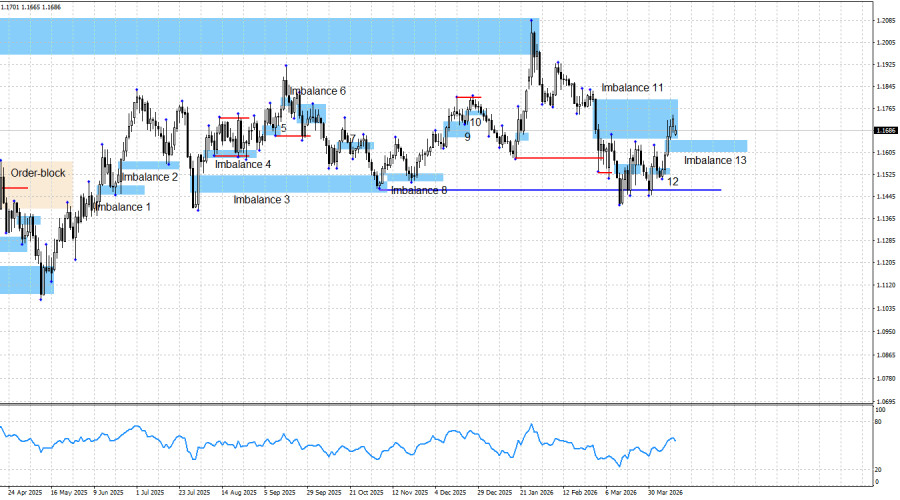 Пара EUR/USD росла пятый день подряд на ожиданиях достижения перемирия между Ираном и США, которым не суждено было сбыться. Я не хотел бы быть слишком категоричным, но шансы на устойчивый мир, достигнутый за одну официальную встречу США и Ирана, были изначально крайне низкие. Тем не менее, трейдеры верили в лучшее, а графическая картина наконец-то поддержала быков. Что и обеспечило недельный рост европейской валюты. Была получена реакция на «бычий» имбаланс 12, после чего и началось наступление быков. Безусловно, если бы геополитика