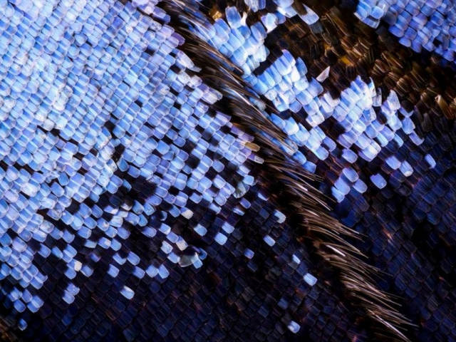 Ее яркая окраска – это оптическая иллюзия, созданная миллиардами крошечных чешуек. Каждая чешуйка – это сложная ребристая структура, которая преломляет свет, создавая невероятные неоновые оттенки. При сильном увеличении крыло превращается в бесконечные ряды черепицы, похожие на чешую дракона или футуристические солнечные панели. Ребристость чешуек напоминает текстуру инопланетных кораллов, светящихся изнутри. Это мир, где цвет рождается не из пигмента, а из нано-геометрии, создавая ошеломляющий ландшафт, скрытый в каждом взмахе крыла... бабочки.