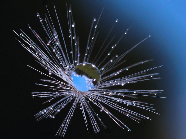 Перед нами мир невероятной хрупкости и сложной аэродинамики, где сотни тончайших ворсинок создают идеальный парашют. При сильном увеличении эти ворсинки напоминают сложную паутину, усыпанную крошечными каплями воды. В центре, где все они сходятся, структура выглядит как ядро хрупкой замерзшей звезды или как нейронная сеть, застывшая в ожидании импульса. Здесь легкость возведена в абсолют, создавая Вселенную, которая может разрушиться от малейшего дыхания, но способна преодолевать километры в поисках новой жизни. Хрупкая пушинка одуванчика на ветру…