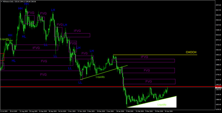 На дневном ТФ продолжается формирование нисходящей тенденции и коррекции против нее. Ключевым паттерном на продажу выступал и выступает «медвежий» Order-block на недельном ТФ. Как мы и предупреждали, движение, спровоцированное этим сигналом, может быть сильным и длительным. После его формирования эфир подешевел на 55% или на 2 500$. В ближайшее эфир может продолжить слабую восходящую коррекцию, но любая коррекция рано или поздно заканчивается. На 4-часовом ТФ эфир весьма неплохо отработал все последние FVG, но движения по-прежнему слабые, коррекционные. Таким образом, мы ожидаем сигналов на дневном ТФ о завершении коррекции, коими могут выступать отработка ближайших FVG.