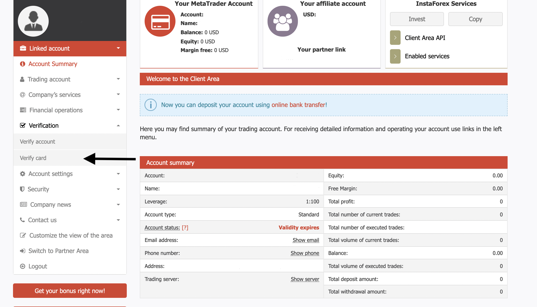To upload a photo of your bank card, please log in to your Client Area, choose Verification in the menu on the left and then click Verify card. On this webpage, you will be able to upload photos of the front and back sides of your bank card. Please don’t forget to hide the sensitive data on the images.