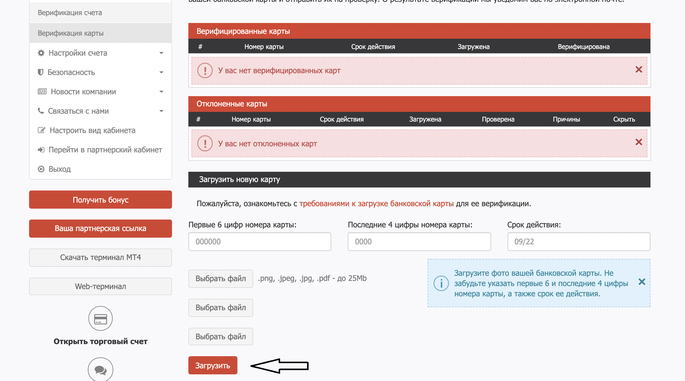 Будь ласка, увійдіть в кабінет клієнта свого торгового рахунку, в лівому меню виберіть Верифікація, потім "Верифікація карти". На сторінці, ви зможете завантажити фото лицьового та зворотного боків карти. Зверніть увагу на необхідність приховування сенситивних даних на фотографіях.